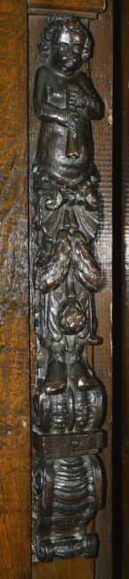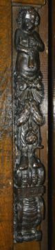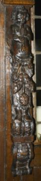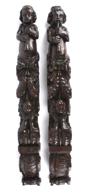 Two oak caryatids, late 18th/19th centuryof typical form with putti playing flutes above berry and leaf tendrils upon a scrolled carved base, (2) height 78 cmCondition: Good condition with obvious wear throughout, each have previously come from a larger item of furniture, now been cut down, splitting and screw holes apparent