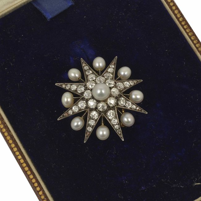 A good Victorian diamond and pearl brooch of star design, with central pearl and old cut diamond cluster within a diamond set star with alternate pearl set points, (tests gold), the case with lower fitted section containing provision for hair piece conversion, fitted Martin & Co of Cheltenham leather case weight 7.9 gm, approx. 3 cm diameterCondition: Overall good