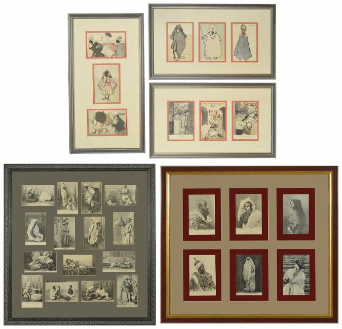 A collection of postcards of Tangier, early 20th centuryenclosed in two frames and further loose examples, together with three framed collection of postcards from Morocco, (5 framed and loose) Condition: Condition is good with wear to the frames and wear to the loose cards