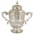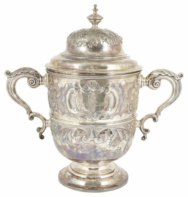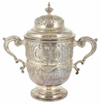 A substantial Victorian silver twin handled trophy cup, London 1892the knopped finial, flower head embossed cover, above a cylindrical acanthus leaf with flower head embossed body, raised upon a tapering circular foot ring, central cartouche inscribed âThe Hill Cupå and on the reverse central cartouche inscribed âWon Byå dating from 1892 to 1896, the interior silver gilt, both bear hallmarks, Charles Stuart Harris, together with an ebonised associated scole base stand, height 39 cm (without base); weight 80 ozt approx.Condition: Nice condition with patination throughout, marks clear, slight dents on the inner rim of coverProvenance: From the estate of the late Patrick Thomas Corrie Lewin