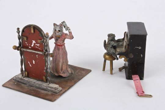 A Franz Bergman cold painted bronze cat, 20th centurymodelled as a cat brushing her hair in front of a mirror, mark to base, together with another cat playing a piano measuring tape, (2) height 6.5 cm (cat & mirror), height 4.5 cm Condition: Condition is fair with wear to paintwork