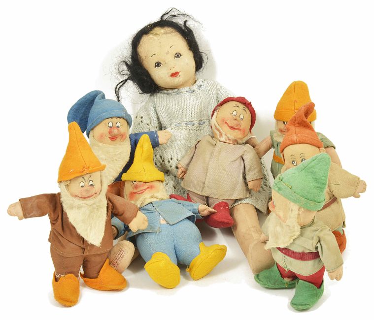 A set of Chad Valley Snow White and the Seven Dwarves1930's, the set comprising Snow White (wearing replaced dress), together with the Seven Dwarves each wearing their original clothes, Snow White with original Chad Valley stitched label to base of foot. height of Snow White 41.5 cm Condition: One dwarf missing glasses, another missing red belt and wear to beard, another missing orange belt. Snow White with untidy messy hair and some staining and replaced clothes. Overall in worn condition needing some TLC