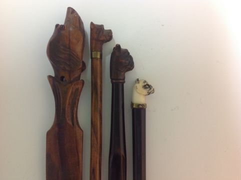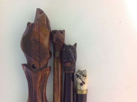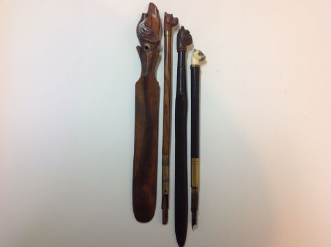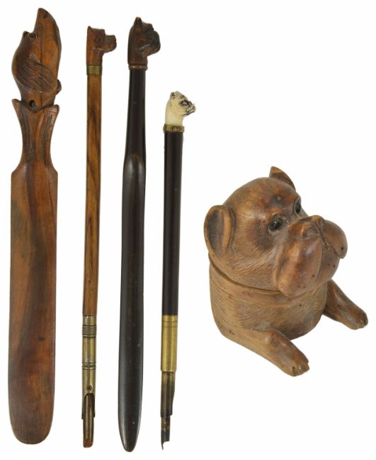 An ivory pug dog headed ebonised fountain pen,together with a pug dog headed ebonised paper knife, another pug dog headed paper fountain pen, dog headed hinged inkwell and another dog paper knife (5) Condition: Fair to good condition, nibs of two fountain pens worn, carving of dog heads good, inkwell hinge loose