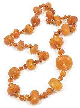 An impressive butterscotch amber bead necklace formed of graduated large polished disc shaped beads of slightly irregular form, the discs spaced with doubles and trios of smaller rounded beads. Total weight approx. 245.4g Condition: Overall good, some scuffing