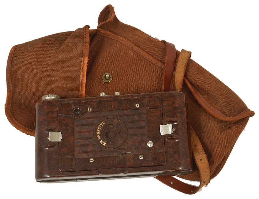 A 1930's Eastman Kodak No.2 Hawkette bellows folding roll film Bakelite cameraof rectangular form with speckled brown finish, impressed in white No.2 Hawkette around lens, with carry case, Condition: Condition is fair, not tested if camera works, case in worn condition