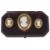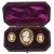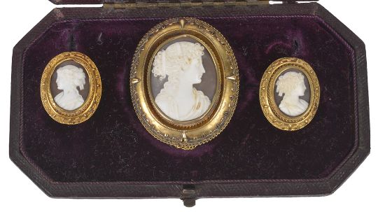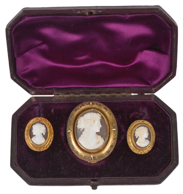 A Victorian Etruscan style classical portrait cameo brooch and earringsthe yellow metal oval brooch mount with thread work decoration (tests for gold) set with an oval carved shell portrait cameo of a classical Roman lady seated dexter, locket glass to reverse, together with the matching earrings with facing cameos, in fitted case,circa 1860 Brooch measures approx. 4.5 cm. x 3.75 cm. earrings approx. 23x19 mm.total weight approx. 20.3 gm.Condition: some damage to the four 'jewels' around brooch mount, inner mount to brooch cameo slightly misshapen, slight bend to fastening pin end, right earring inner cameo mount misshapen, left earring back fastening absent