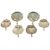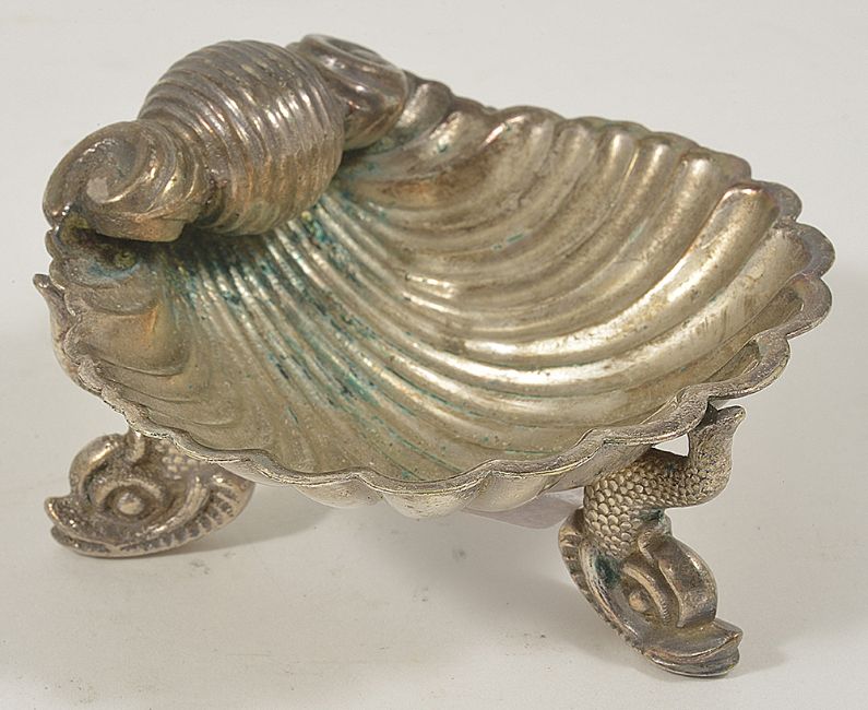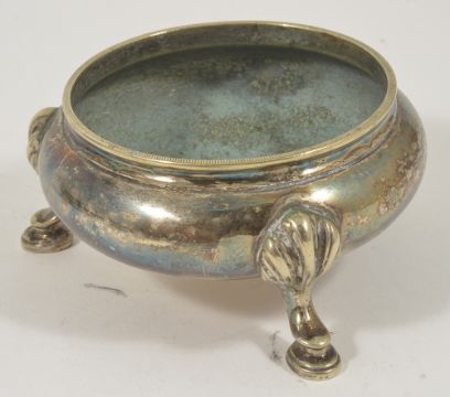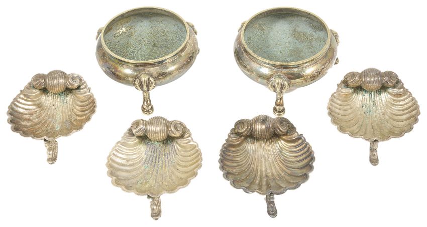 A collection of silver plated table salts,comprising of four scallop formed salts upon three dolphin supports and a pair of circular salts with three pad supports, (6) scallop height: 4 cm, circular height: 4.3 cmCondition: Condition is used with staining on each of the salts, pitting to interior of circular salts