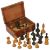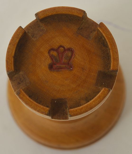 A mahogany cased chess set probably by Jaques Staunton, comprising of 32 pieces, a rook and a knight in each side marked with a red crown, red felt bases to each, (32) king: 7 cm high; pawn: 3.5 cm high Condition: Condition of mahogany box is good with wear to exterior, not fitted interior; Condition of the chess pieces if fair to good, with wear to each piece, chip to top of ebony bishop, split to base of ebony knight, chips to pawn collars in both sides, chip to bishop top, weighted, A/F