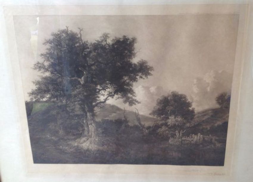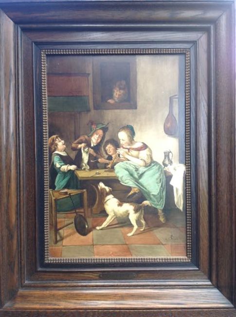 A contemporary copy of a 17th century Dutch master'Dancing kitten tavern scene', together with a Frank Short engraving of a woodland scene with watermark (2) 51cm x 34cm; engraving 27cm x 38cmCondition: Overall good condition