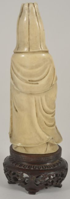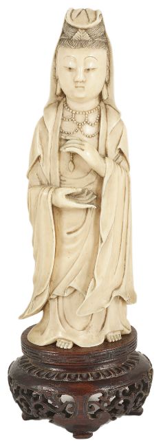An ivory figural carving of Quan Lin, early 20th centurymodelled standing wearing trailing robes and a beaded necklace, upon a hardwood oval base with pierced carving, (2) figure 13.5 cm high, total height: 17.5 cmCondition: Condition is good with wear throughout the figure, signs of dirt, bears no markings, base has signs of wear, old glue mark on base of figure and top on wooden base