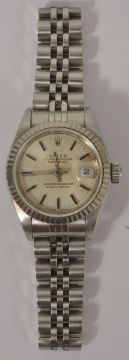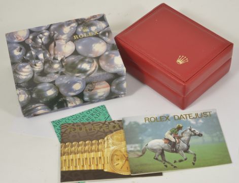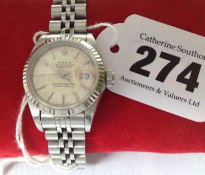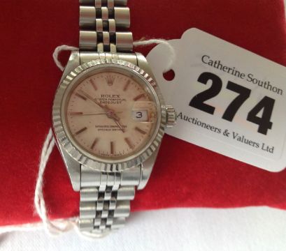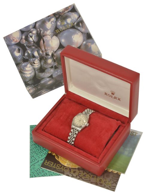 A Rolex Oyster Perpetual Datejust stainless steel ladies wristwatch the champagne dial with baton hours makers, luminous baton hands, subsidiary date aperture at 3, with stainless steel link bracelet with Rolex clasp, dial with monogram, crown with monogram, bracelet with monogram, back of case marked, together with original red leather box with instructions and certificate diameter of case: 25 mm, lug width: 15 mm, bracelet length closed: 127 mm Condition: Condition is good for the case, bracelet, with obvious scratching to case, glass and bracelet, dial has staining, not tested if working, hands do not move unless crown has been opened, dust on dial possible sign of rust