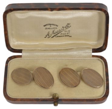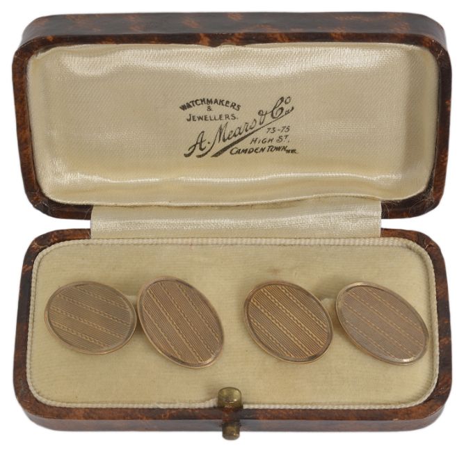 A pair of Art Deco 9ct. gold oval cufflinkschain linked and with engine turned decoration, with associated box approx. weight 7.3 gmsCondition: Overall good no wear to surface or chain