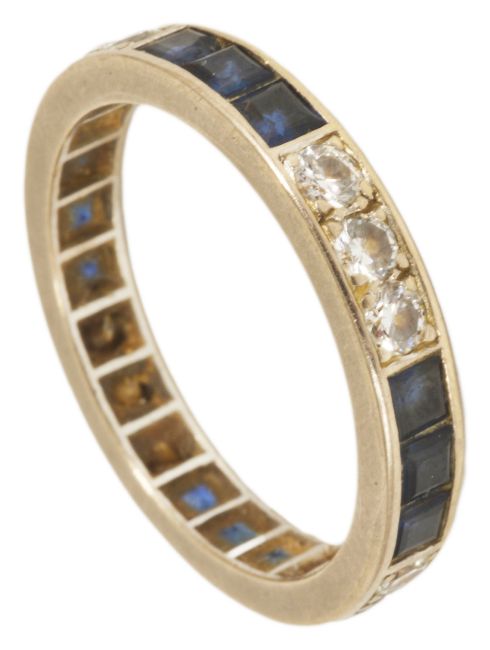 A sapphire and diamond set full eternity ringthe white metal mount set with three square cut sapphires alternating with three circular diamonds, in associated Mappin & Webb box Approx. total diamond weight 0.75ct, size P/QCondition: overall good, stones bright and well matched, could do with a clean