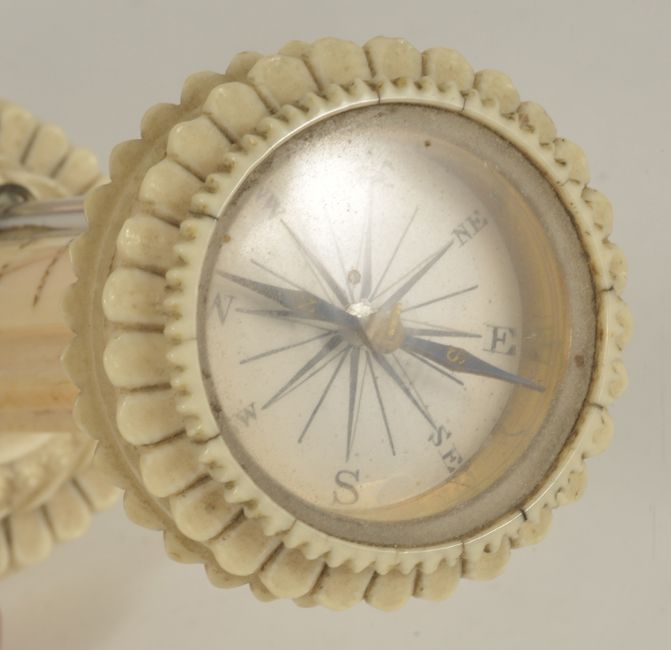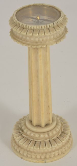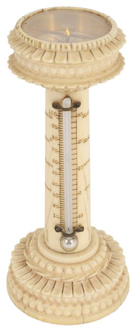 A late 19th century ivory compass thermometer,in the form of a column with circular compass inset top with lappet borders, above a mercury glass tube with engraved increments either side, upon a lappet and bead decorated circular base, 11 cm highCondition: Condition is good with wear throughout the item, signs of dirt inside the compass, cracks apparent in the ivory base and column