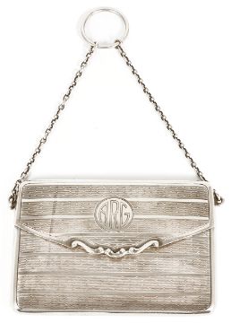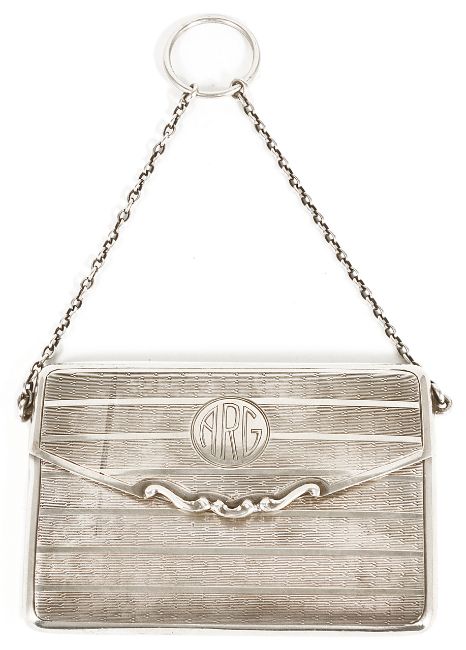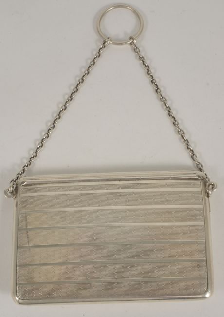 A silver Mappin and Webb card case/pursehallmarked Birmingham 1919, the engine turned ladies purse with envelope style flap initialled ARG, with silver gilt interior, chain strap and finger loop width: 9.5cm, overall weight: 2.5 ozt approxCondition: In very good overall condition, with no obvious condition issues.