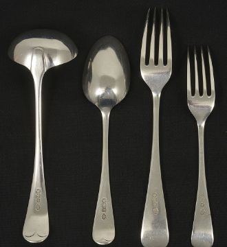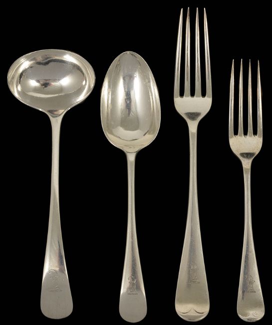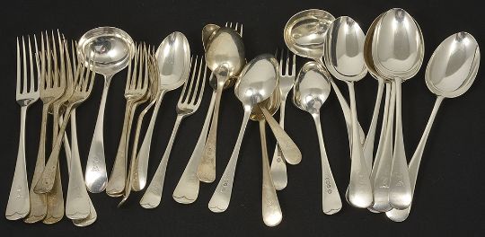A collection of George V silver flatware, Sheffield 1923comprising six table fork, six dessert forks, two sauce ladles,six dessert spoons and six serving spoons, handles engraved crest of Punch, William Hutton & Sons weight: 51 ozt approxCondition: Condition is good with wear to bowls, tines, clear hallmarks