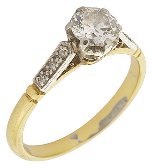 A single stone diamond set ring, the diamond approx. 0.45 ct. set between diamond point detailed shouldered mount, yellow and white metal mount, tests for gold size MCondition: There are some grey 'solder' patches to the inside of the shank, flush with the ring and there is some wear to the sides of the stone mounting