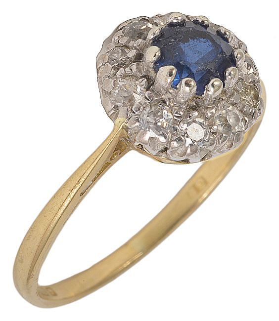 A circular sapphire and diamond cluster ring, the small central sapphire of pleasing colour within a border of diamonds, 18ct gold mount Sapphire approx. 0.40ct, claws are flattened, please note the size is only estimated, ring size PCondition: Some side and shank wear to mount, surface rubbing to sapphire