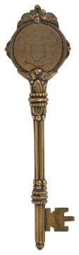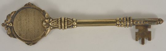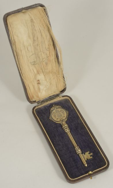 An interesting silver gilt presentation key for the opening of the Borough Maternity Home and War Memorial WandsworthNovember 1920hallmarked London 1920, with armourial to the front and motto reading 'We Serve', the reverse of the key with presentation inscription reading 'Presented to Mrs Cooper Rawson Mayoress of the Metropolitan Borough of Wandsworth on the occasion of the opening of the Borough Maternity Home and War Memorial Nov. 4th 1920, contained within original presentation box length: 11.5 cm., 1.28 ozt approxCondition: The inside of the case is frayed but the key is in good overall condition.After W.W.I The Wandsworth War Memorial Maternity Home was founded as a memorial to the Wandsworth residents who had been killed during the recent war. The home was closed in the mid 1920s and a new Maternity home opened nearby in 1931. The original key for the maternity home can be found in the Science Museum.