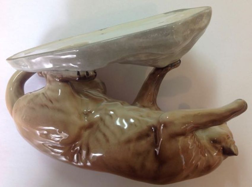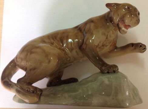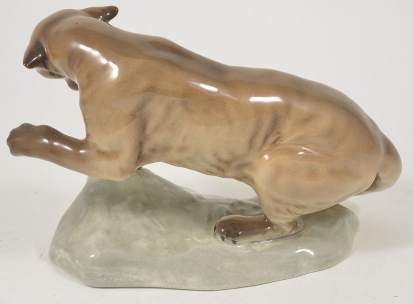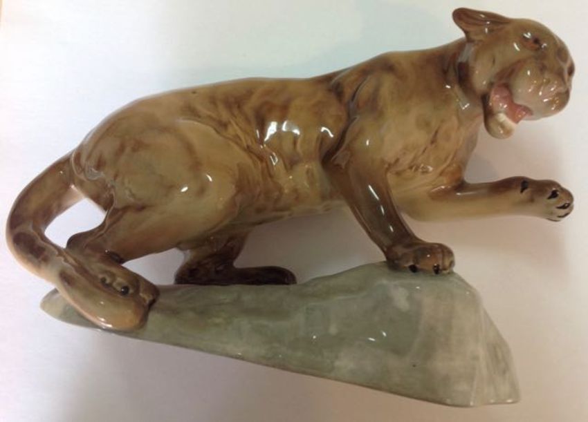 A Beswick puma on rock, 1960'srealistically modelled in a tawny gloss standing on a rock with one paw outstretched and mouth open, impressed marks to base Beswick England and 1823 height: 14 cm, width: 21 cmCondition: Condition is good with no apparent damage or crazing, clear marks to base Beswick England 1823