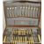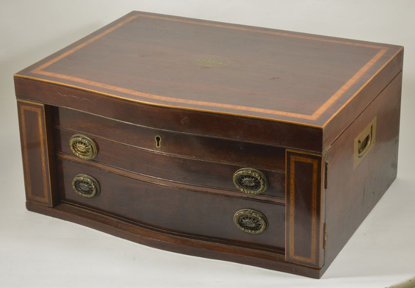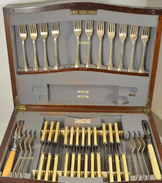 An impressive mahogany canteen of silver cutlery, Sheffield 1918 comprising six serving spoons, twelve soup spoons, two sauce ladles, ten dessert spoons, twelve table forks, eleven dessert forks, soup ladle, gravy spoon, twenty teaspoons, dated 1918, 1919, 1920 and 1948, each with engraved initials TCCL, Atkin Brothers, with ivorine handled knives and carving forks; contained in a fitted mahogany and satinwood banded canteen, with hinged lid above two drawers, key with canteen, and three miscellaneous teaspoons and an EPNS teaspoon weight: 138 ozt approx, canteen measures: 22 x 47 x 35.5 cmCondition: Condition of canteen is fair, with wear to the exterior and interior, scratches, chips and dents apparent to exterior, case faded; condition of cutlery is fair to good with wear to blades, bowls and tines, scratches with handles of cutlery