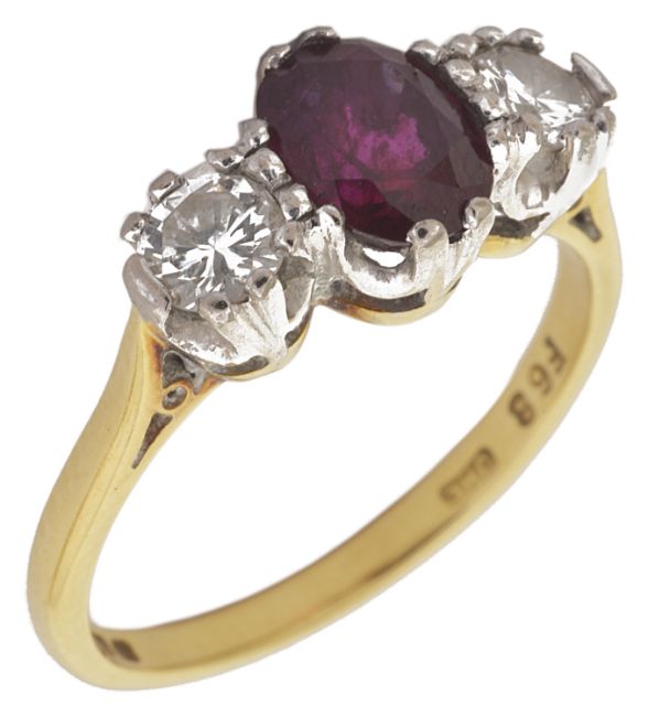 A ruby and diamond three stone ringwith central oval ruby of pleasing colour approx. weight 1.00 ct. set between single diamonds to either side, 18ct gold mount size N, ruby approx. weight 1.00ctCondition: Overall good slight wear to ring mount