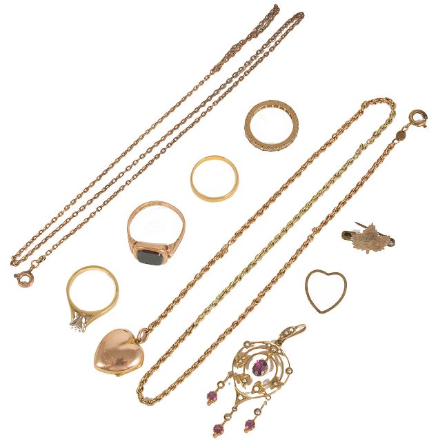 A 9ct gold Art Noveau amethyst and split pearl drop pendanttogether with a 9ct gold and pearl set heart picture locket attached to a yellow metal chain a.f., a 9ct gold bloodstone set signet ring, an 18ct illusion set single stone diamond ring, a 22ct gold band, a small maple leaf pin and a 9ct gold eternity ring (7) pendant approx. 5 x 2 cm. signet ring size Q/R. Total weight of all items approx. 22.6 gm.Condition: Pendant overall good condition, wear to diamond ring, 22ct band and eternity ring, heart locket overall good, signet ring overall good, suggest view in person