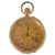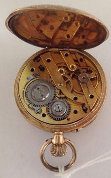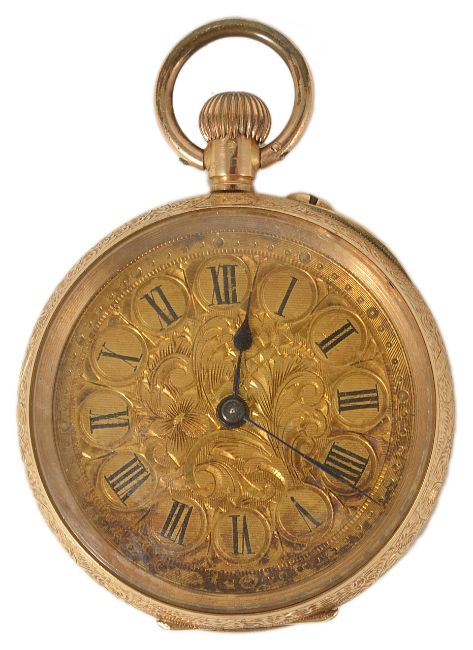 A 14K gold Ladies open cased pocket watchwith gilt foliate engraved dial with Roman numeral hours, dot minutes and spade hands, case no. 270040, exterior of case with foliate engraved decoration dial diameter: 29 mm; total weight: 26 g approxCondition: Condition is good with wear and minor scratches to the crystal and case interior and exterior, running at time of cataloguing, mechanism Not tested
