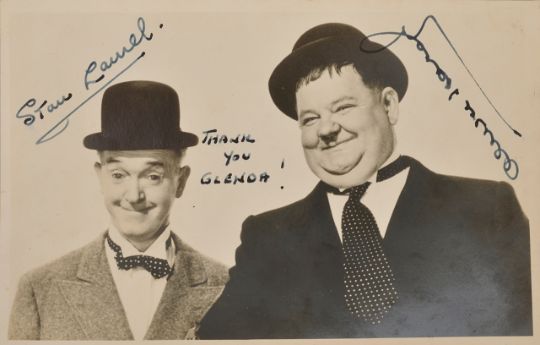 A signed black and white publicity photograph of Laurel and Hardysigned in black ink by Stan Laurel and Oliver Hardy, and to the centre inscribed Thank you Glenda! 8.8 x 13.5cmCondition: Good clear signatures with no obvious damage or staining to the postcardThe current owner was 11 years old in 1951 when she saw Laurel and Hardy at the Theatre Royal Norwich. She had tea afterwards at the Royal Hotel Norwich where Laurel and Hardy were staying, and there she spoke to them and received their autographs.