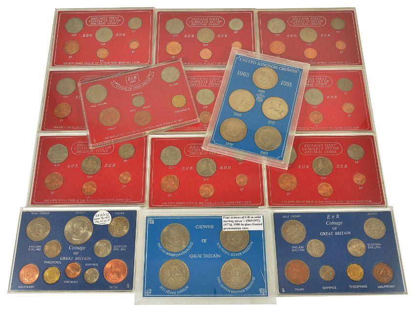 A collection of British Coinage setsto include Britain's First Complete Set of Decimal Coins Queen Elizabeth II comprising of 9 x 6 coin cased sets 1968 - 1969 - 1971 and a Queen Elizabeth II 1967 coinage of Great Britain, a Queen Elizabeth II 1966 coinage of Great Britain, a Queen Elizabeth II 1956 - 1967 Coinage of Great Britain, a cased set of four Crown of Great Britain 1965 - 1980, a cased set of five United Kingdom Crowns 1965 - 1981, (14 sets) Condition: Condition is good for each set, each coin in a cardboard mount in plastic cases