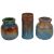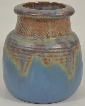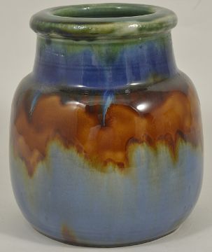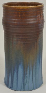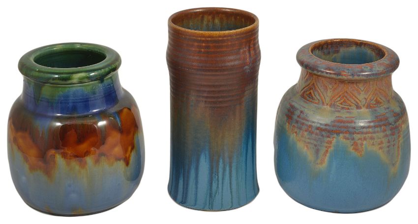 A selection of Bourne Denby pottery jars, mid 20th centurycomprising of a cylindrical tall ribbed jar with partially matt brownish blue drip glaze, and two squat jars, one with green bluish orange drip glaze and the other in a partially matt blue reddish brown glaze with incised decorated neck, all bearing printed marks to bases, (3) height: cylindrical - 22.5 cm; squat - 18.5 cmCondition: Condition is good for each jar, slight wear to glazes, no apparent damage, marks clear to bases,