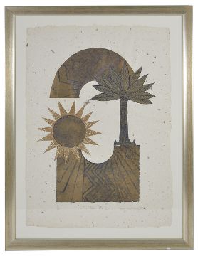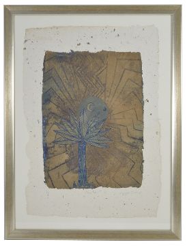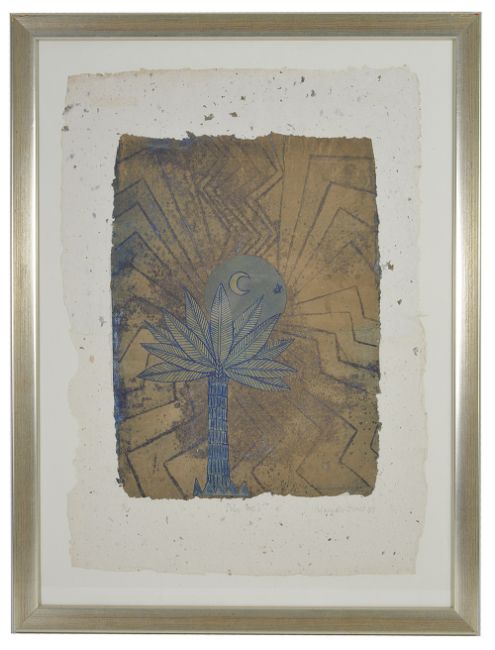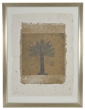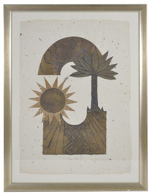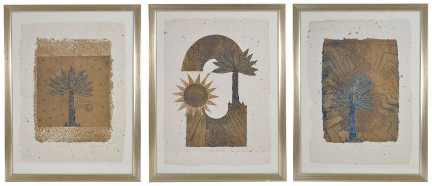 Mary Rose O'Neill (Irish b. 1961)the Palm Series 'Palm Tree I', 'Palm Tree II', 'Palm Tree III', drawn stylised palm trees collage on layered handmade paper laid on board, dated 1989, each titled and signed on lower right with Limited Edition numbers 8 of 20, Mary Rose O'Neill born in Cork, studied in Dun Laoghire School of Art and Design and the Crawford College of Art and Design in Cork and Art Sake in Toronto, Canada, (3) 74.6 by 56.5 cm total frameCondition: Condition is good with wear to the frames, handmade paper slightly wrinkled inside frames