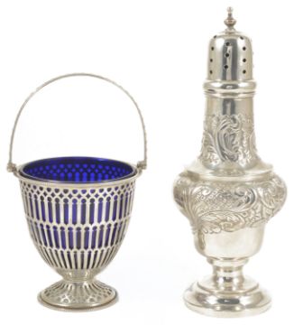 A silver pierced basket with blue glass liner, Birmingham 1928the basket with swing handle and pierced strapwork sides and pedestal circular foot, Barker Brother Silver Ltd and a silver sifter, Birmingham, the pierced lid above a baluster flower head embossed body upon a circular pedestal foot, (2) weight: 7.20 ozt approx.Condition: Condition of basket with good with hallmarks slightly rubbed, no apparent splitting in pierced work or damage to blue glass liner; Sifter has mark rubbed and dents to body and lid