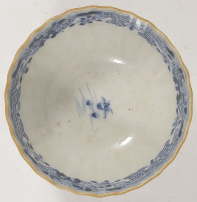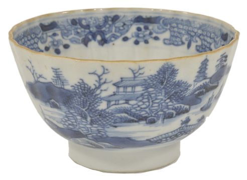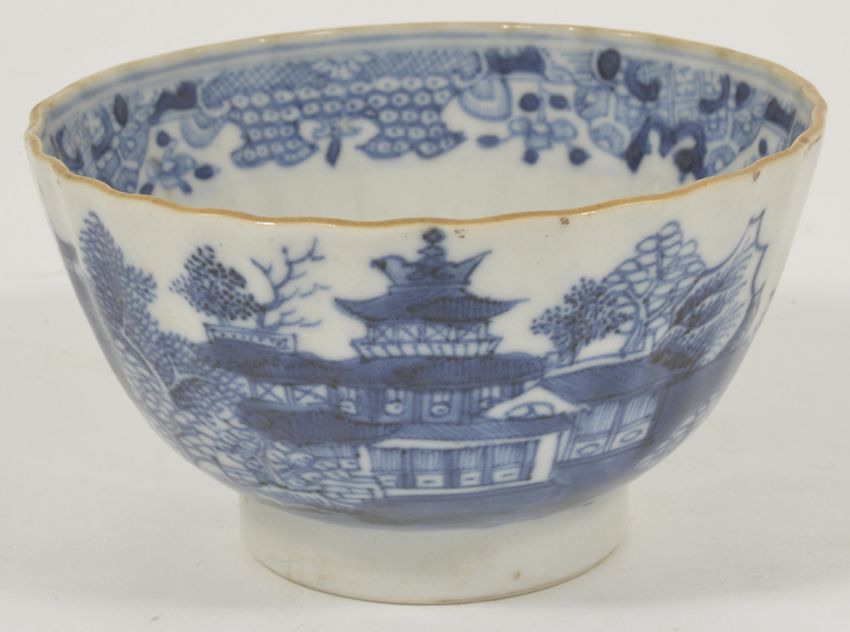 A blue and white porcelain tea bowl, 18th century, possibly Caughley,of circular gadrooned form, the interior with a hatched band, the exterior decorated with pagoda's amongst mountainous landscapes, upon a circular foot ring height: 5.1 cm diameter: 9 cmCondition: Condition is good with slight pitting to rim, bears no marks