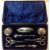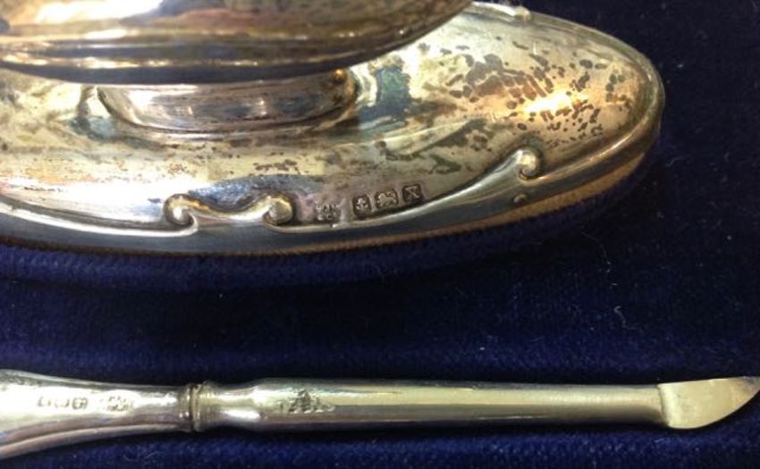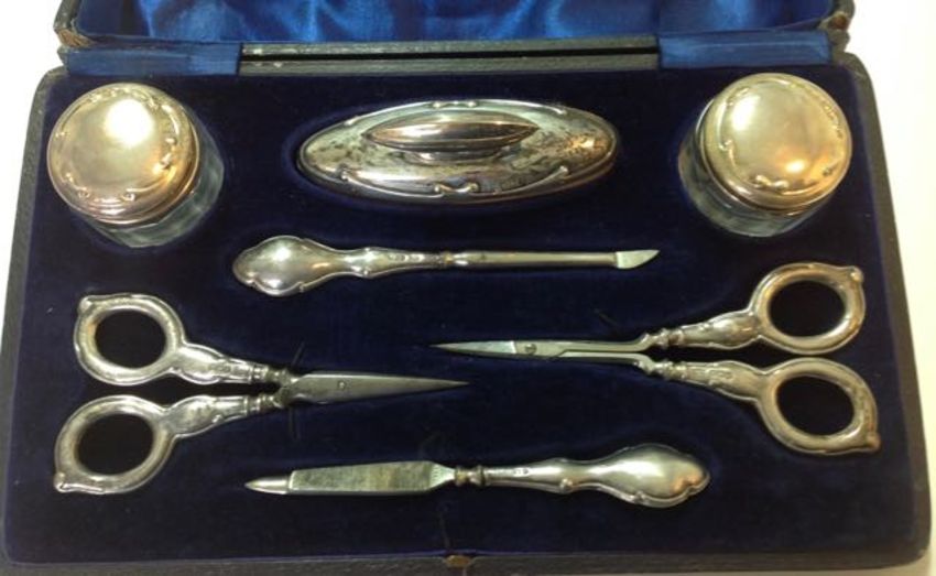 A George V silver mounted manicure suite, Birmingham 1921comprising of a nail buffer, scissors, nail file, cuticle remover and two glass boxes, each with silver handles or covers, W J Myatt & Co., enclosed in the fitted case, (8) weight of unfilled items: 0.28 ozt approx, size of case: height: 5.5 cm, width: 24 cm, depth: 13.5 cmCondition: Condition is fair to good with wear to the case, damage to the hinges of the case, hallmarks slightly rubbed on some of the silver items, no apparent dents or splits in the silver.