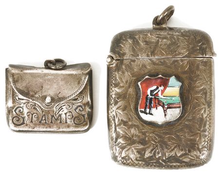 Snooker interest: An Edwardian silver vesta case, Chester 1906with applied enamel shield depicting a snooker player, surrounded by foliate engraved decoration, makers mark rubbed and an Edwardian silver stamp holder, Birmingham 1916, of envelope form engraved Stamps, Crisford & Norris Ltd, (2) weight: 0.8 ozt approx, stamps: 2.2 x 3 cm, vesta: 5 x 3.2 cmCondition: Condition is fair, with wear to both items, Stamps: dents and splits in silver, slightly out of shape, Vesta: marks rubbed, tarnished.