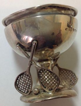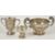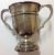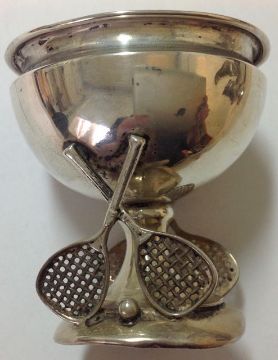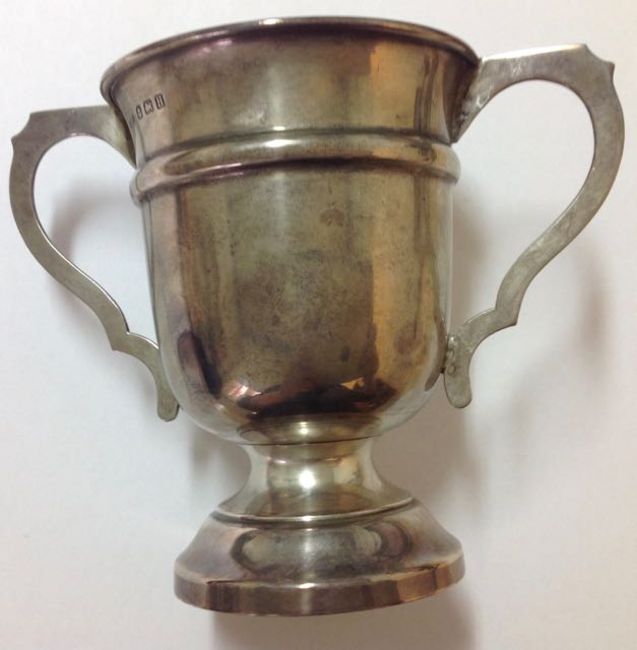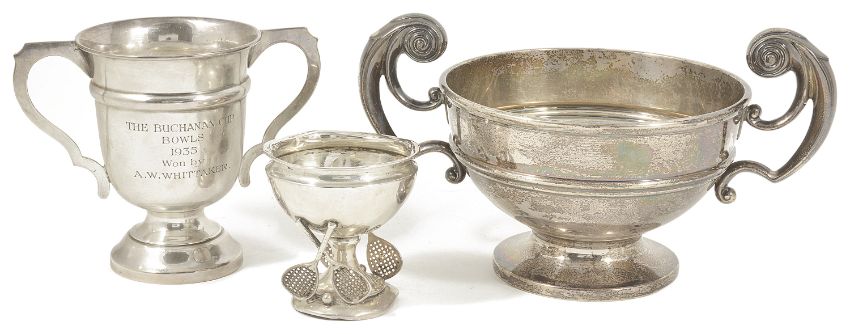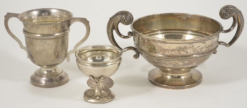Three silver trophy cups, Sheffield 1952, Birmingham 1921 & 1932,a silver twin handled trophy pedestal cup, Sheffield 1952of typical form with scrolled handles and bands on the body upon a circular foot ring, Walker & Hall, together with a silver tennis trophy cup, Birmingham 1921, modelled as a circular pedestal cup with crossed tennis rackets either side, makers mark rubbed and a silver twin handled trophy pedestal cup, Birmingham 1932, engraved 'The Buchanan Cup Bowls 1935 won by A.W. Whittaker, Joseph Gloster Ltd, (3) weight: 10 ozt approx, heights: large twin handled cup 10.5 cm high, tennis cup 6.3 cm high, smaller twin handled cup 9.5 cm highCondition: Condition is good for each of the items, with wear throughout each, marks rubbed, slight dents to body, upper and lower rims of the tennis cup