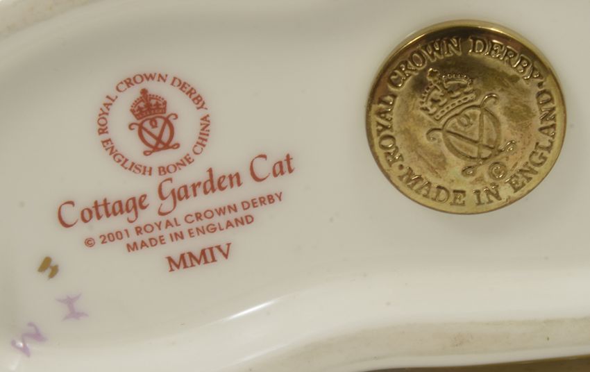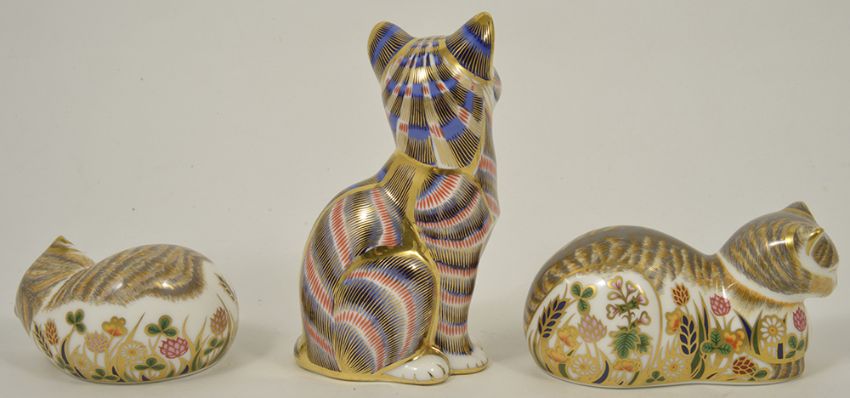 A group of three Royal Crown Derby paperweights in the form of cats and kittensthe first modelled as a Cottage Garden Kitten modelled in a curled up position and another Cottage Kitten in a laying position, the third as a seated cat decorated in a red and blue colourways, all embellished in gilt decoration and all with printed marks to base, (3) the former length 9cmCondition: Unboxed, and two with stoppers. All in very good condition with no chips, cracks or damage.