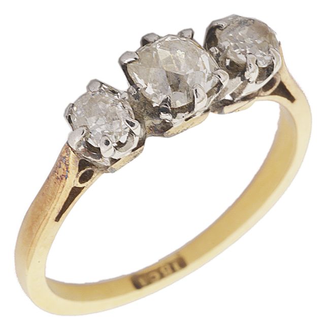 An 18ct gold mounted three stone diamond set ringon an 18ct gold band size L, centre stone approx. 025 ct.Condition: Damage to both side side stones edge chips, mount has deep ring wear to either side of the setting