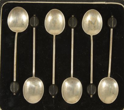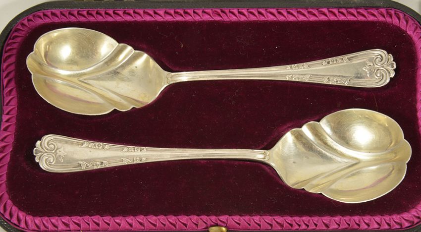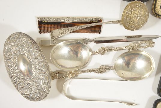 A collection of silver spoonsto include a cased set of six silver coffee bean spoons, Birmingham 1936, William Suckling Ltd, a cased set of two serving spoons, Sheffield 1901, with shaped bowls, Richard Richardson, a cased set of six teaspoons and sugar tongs, Sheffield 1907, with foliate engraved handles, John Roberts and a pair of silver berry handled spoons, Sheffield 1900, with branch berry handles, possibly Harrison Brothers & Howson, a silver handle letter opener, Sheffield 1972, a sugar tongs, a silver mounted brush and comb and a silver sifter spoon, (22) weight of cutlery: 12.6 ozt approx (not including brush comb or letter opener)Condition: