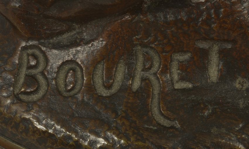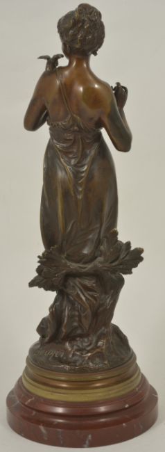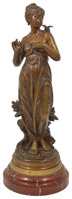 Eutrope Bouret (French 1833 - 1906)a bronze maiden with a bird resting upon her left shoulder, standing in front of a tree trunk, upon a stepped red marble base, signed to reverse Bouret height: 34 cm Condition: Condition is good, minor knocks and chips to the base, minor scratches to body