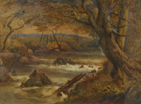 British School early 19th Century watercolour and other, the former tree lined river bank with rushing river over rocks, together with late 19th century watercolour, peaceful country river scene with hay cart and horses in the distance, signed Dean lower left gilt frame (2) 43 x 66 cm, 41 x 52.5 cmCondition: Overall good for both