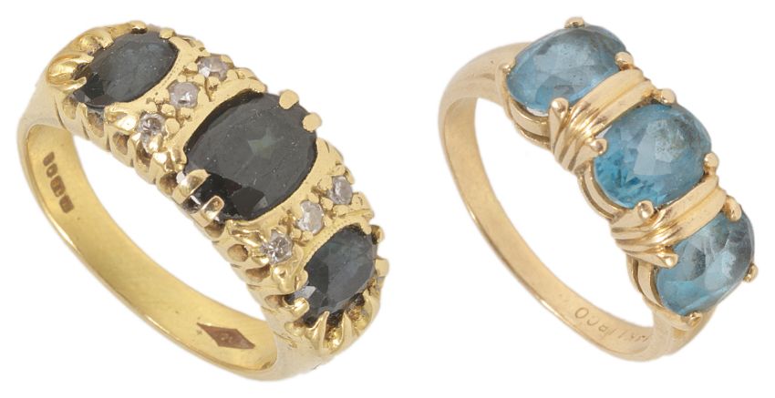A sapphire and diamond set dress ring and anotherthe three stone Australian dark sapphire set ring with small diamond line detail, 18ct gold mount, together with a 'Libco' 14K three stone gem set dress ring (2) sapphire size P, gem ring M/N sapphire ring approx. weight 8.1 gm, gem set ring approx. weight 3.5 gm.Condition: Sapphire ring rubbing to mount and sapphire surface