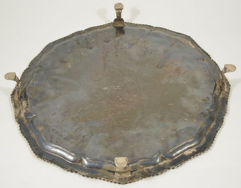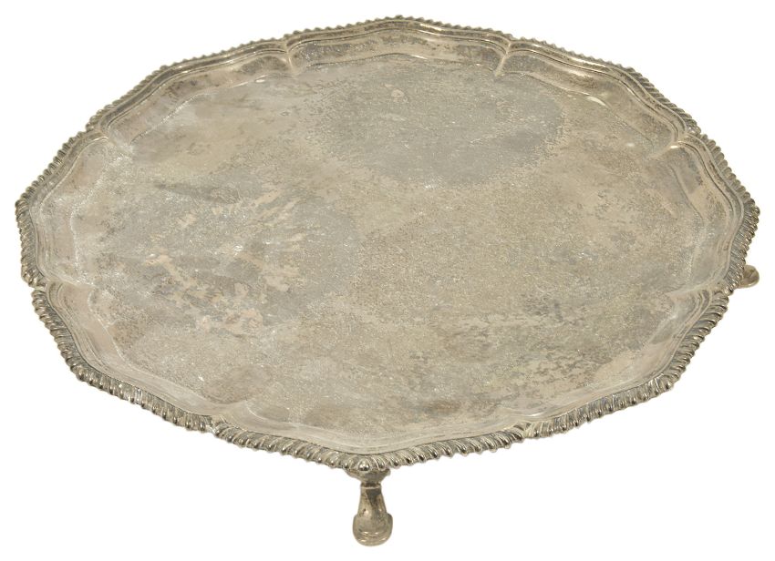 A George V silver salver, London 1928the shaped border with gadrooned edge, raised upon three pad supports, engraved armourial to centre of salver, Hawksworth, Eyre & Co. Ltd weight: 43 ozt approx, diameter: 35.5 cm, height: 4.4 cmCondition: Condition is good, tarnished, marks clears to reverse, slight scratches to top