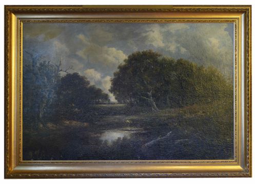 British school 19th Century'Hampstead Heath', extensive view with distant figures, in the manner of Constable, oil on artists board, unsigned, ornate gilt and gesso frame 59 x 90 cm.Condition: Good, both panel and frame
