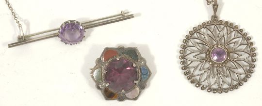 Victorian and later silver jewelleryto include a Victorian silver Etruscan style hinged bangle by Robert James Dick, associated box, a Victorian articulated fancy chain and ball design bracelet (testes silver), in associated box, an Art Deco .925 amethyst and marquisette pierced pendant, an amethyst white metal bar brooch and a sterling silver paste and hard stone 'Scottish pebble brooch (5) total weight of items excluding boxes approx 80.6 gm.Condition: Two slight dents on the 'plain' hinged section. of the hinged bangle, otherwise items are in good order, no repairs or undue wear