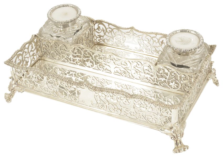 A Victorian silver desk stand, London 1891of rectangular form with ribbed foliate pierced grille sides with central shield and three internal dividers, raised upon scrolled supports, together with matching square glass ink bottles with silver hinged covers, Walter & John Barnard weight of stand: 17 ozt approx, stand measures: 5.8 x 23 x 14.2 cm; bottles measures: 5.6 x 5.3 x 4.9 cmCondition: Condition is good for the stand and two bottles, wear to silver hallmarks, no apparent splits to pierced grille areas or dents to body, glass inkwells in good condition with no apparent damage to exteriors or interior openings.