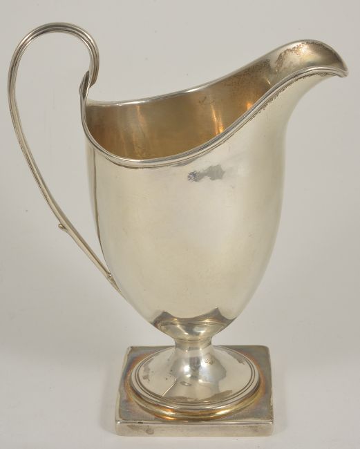 A George III silver cream jug, London 1790of helmet form with ribbed handle upon a square pedestal base, marked for Charles Chesterman II height: 14.2 cm, weight: 4 ozt approx.Condition: Condition is good with wear appropriate to age, minor scratches to body, possible repair to pedestal