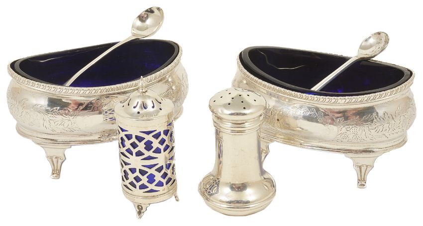 A pair of George III silver oval shaped salts, London 1806with gadrooned borders above foliate engraved body upon four splayed supports, with blue glass liners, with silver spoon and EPNS spoon, with a silver pierced and blue glass pepperette, London, 1921 and a silver pepperette, Birmingham, (4) weight: 5 ozt approxCondition: Condition of both salts heavily polished and worn, repairs apparent to bases of both, chips to blue glass liners, one spoon replaced (plated), pepperette base and top dented.