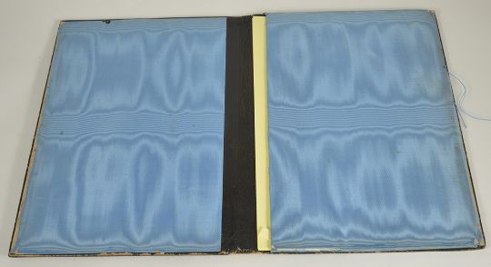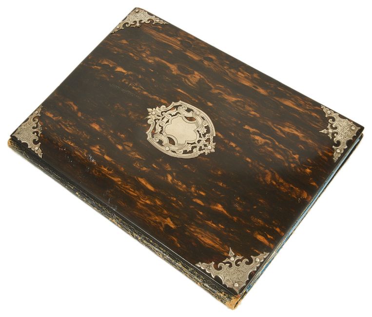 A Victorian silver mounted coromandel covered blottereach of the corners of the blotter mounted with pierced and decorated silver edges the centre also with pierced silver cartouche, opening up to reveal blue silk lined interior length: 30 cmCondition: The coromandel is generally in very good condition with a few minor surface scratches. The spine is a little worn but is still intact. The inside a little frayed and detached with wear over the years. Silver corner mounts are worn, some with damage and parts missing. Overall in good to average condition